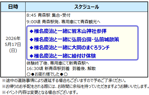 ※妊娠中の方、車椅子をご利用の方、お体の不自由(杖など)な方、その他特別な配慮が必要な場合はその旨をお申し込み時に必ずご入力ください。※アレルギーをお持ちの方はお申し込み時にお申し出ください。 可能な限り対応させていただきますが、ご希望に添えない場合がございます。予めご了承ください。※食べ物の好き嫌い(食べられない等)の対応にはお応えできません。
